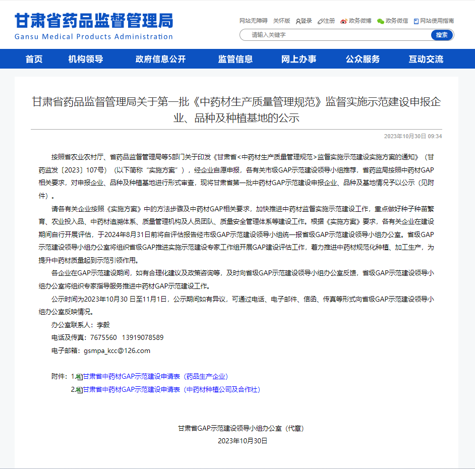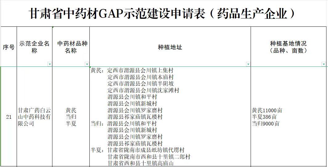 按照省农业农村厅、省药品监督管理局等5部门发出的《甘肃省<中药材生产质量管理规范>监督实施示范建设实施方案的通知》(甘药监发〔2023〕107号)(以下简称“实施方案”),甘肃广药白云山中药科技有限公司(以下简称:甘肃公司)积极申报。经市级GAP示范建设领导小组推荐,省药监局按照中药材GAP相关要求,对申报企业、品种及种植基地进行审查,甘肃公司成功进入第一批中药材GAP示范建设名单。