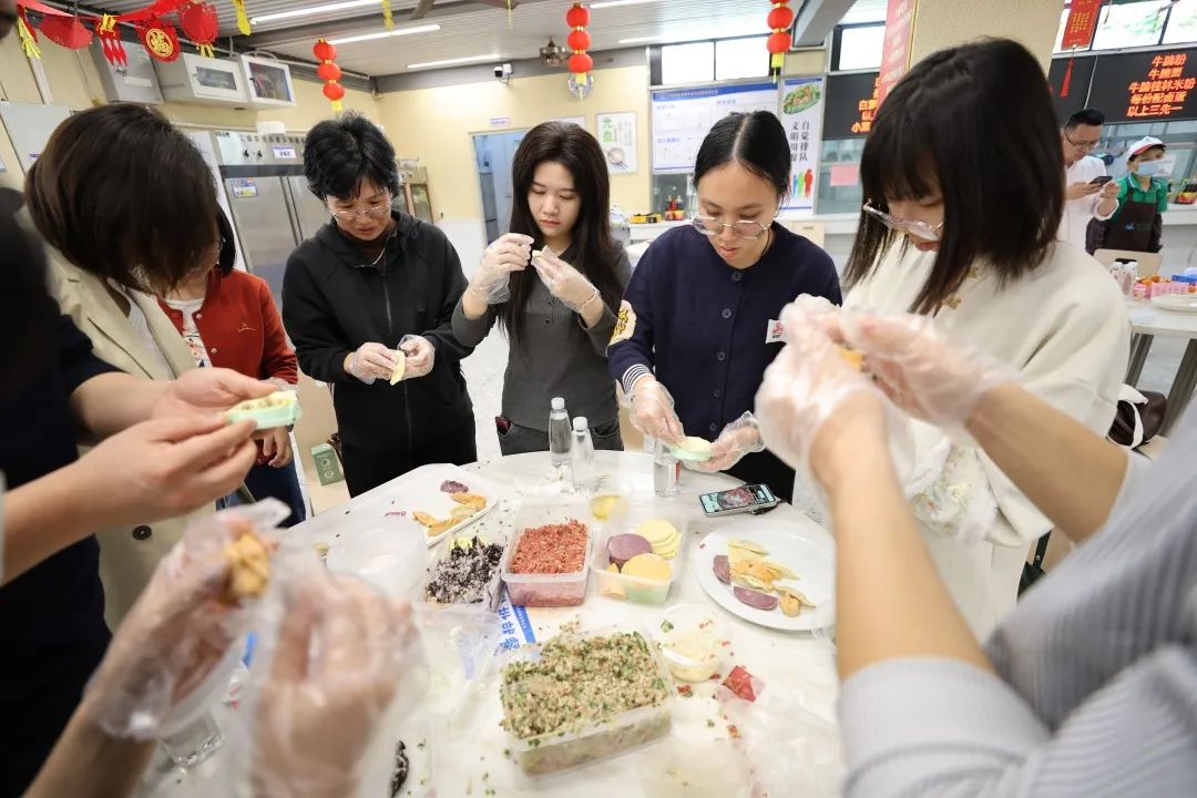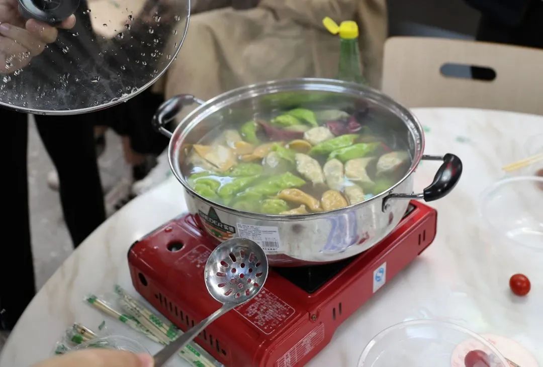 在活动现场里,大家欢声笑语,热闹非凡,围在桌旁,各显身手,分工有序、默契配合,有的帮忙装肉馅、有的递饺子皮、有的在摆造型······在热闹欢乐的氛围中,不一会儿,一个个饱含家的味道的饺子就包好了。