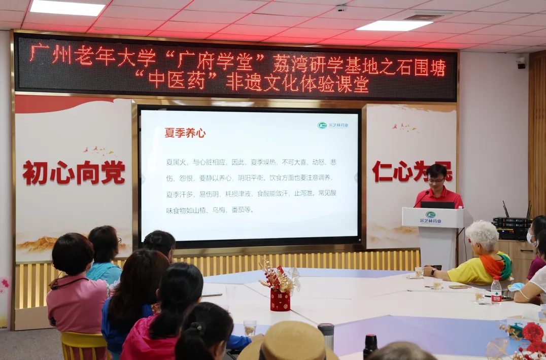 课堂上,采芝林药业非遗文化部副部长黄小龙围绕《常用中药材鉴别与应用——夏季药膳分享》这一课题,并结合老年人的身体特质和健康需求,详细地讲授了关于常用中药材的鉴别技巧、功效应用,以及健康饮食、运动锻炼、心理调节等中药知识与养生妙招。以岭南地区暑湿热的气候特点,有针对性地向大家推荐了多款夏季养生汤方,引导学员们树立科学养生观念,掌握实用养生技巧。