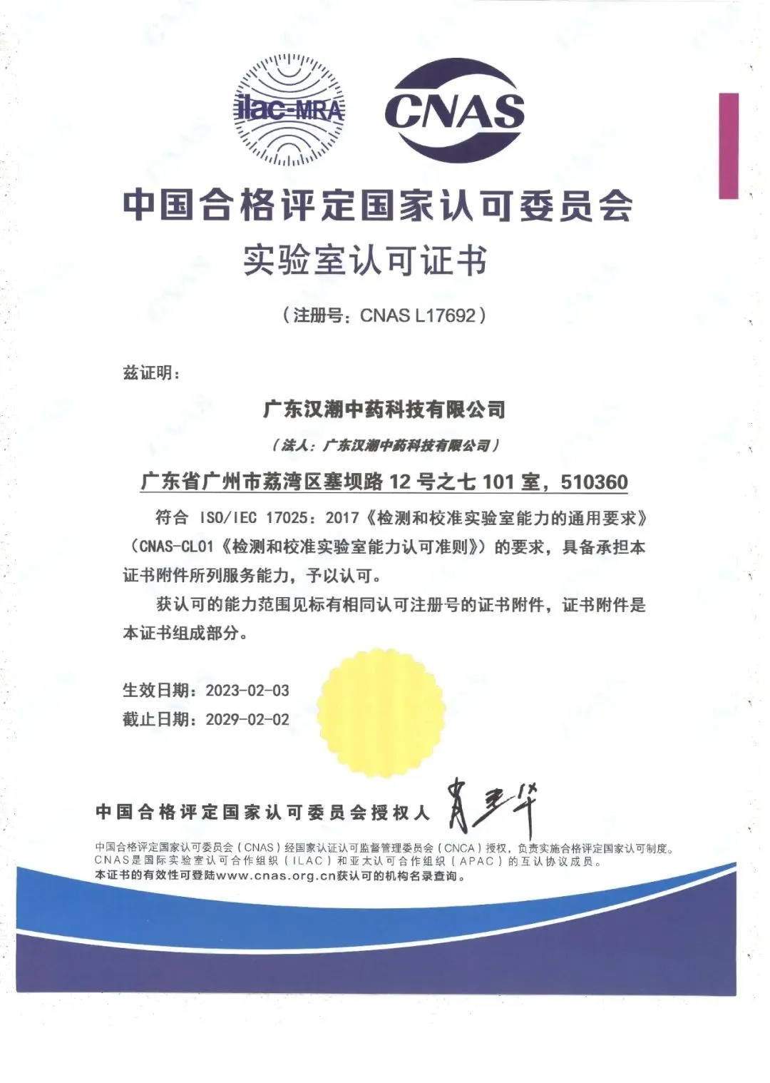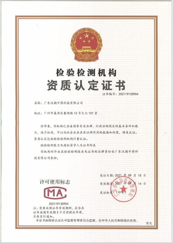 汉潮公司先后通过CMA资质认定和CNAS实验室认可,成为同时具备检测领域双证资质的检测机构,涵盖中药、化药、食品、农作物等领域。