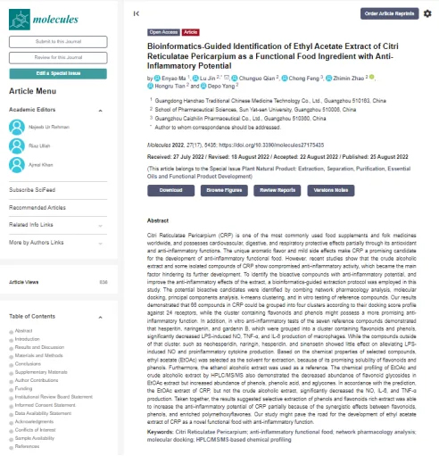 汉潮公司通过五大研究板块协同推进,联合中山大学、暨南大学及广州中医药大学等知名高校,成功打造中药材产学研用一体化中药农业技术体系,实现了全产业链质控,提升了中药材的科学化、集约化水平,有力推动了中药材科学生产产业化进程。2023年,汉潮公司联合中山大学在国际期刊“Molecules”刊登了广陈皮研究论文“Bioinformatics-Guided Identification of Ethyl Acetate Extract of Citri Reticulatae Pericarpiumas a Functional Food Ingredient with Anti-Inflammatory Potential”(生物信息学证明陈皮乙酸乙酯提取物为具有抗炎潜力的功能性食品辅料)。此后,资源团队持续发力,共计联合发表SCI论文及中文核心文章8篇,申请专利3项。