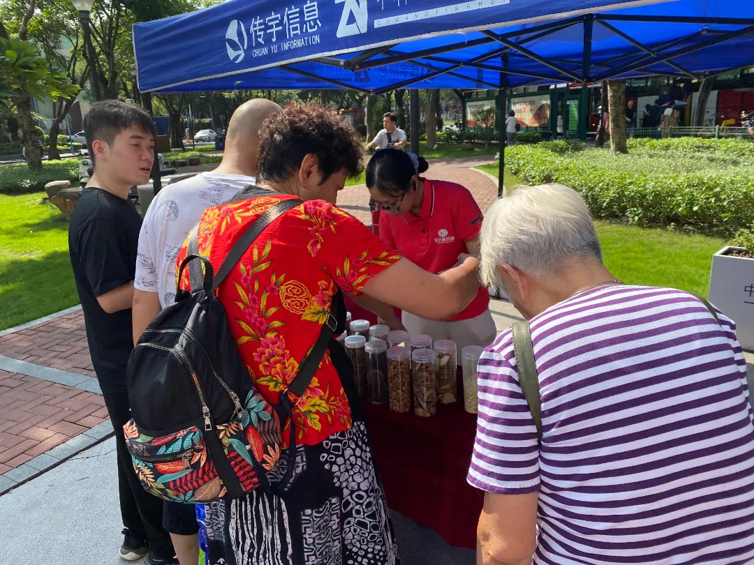 采芝林展位吸引了众多附近居民驻足观看,工作人员通过看、闻、摸、尝的直观形式,向居民科普常用中药材的真伪优劣鉴别方法,并普及了这些中药材在日常生活中的应用。