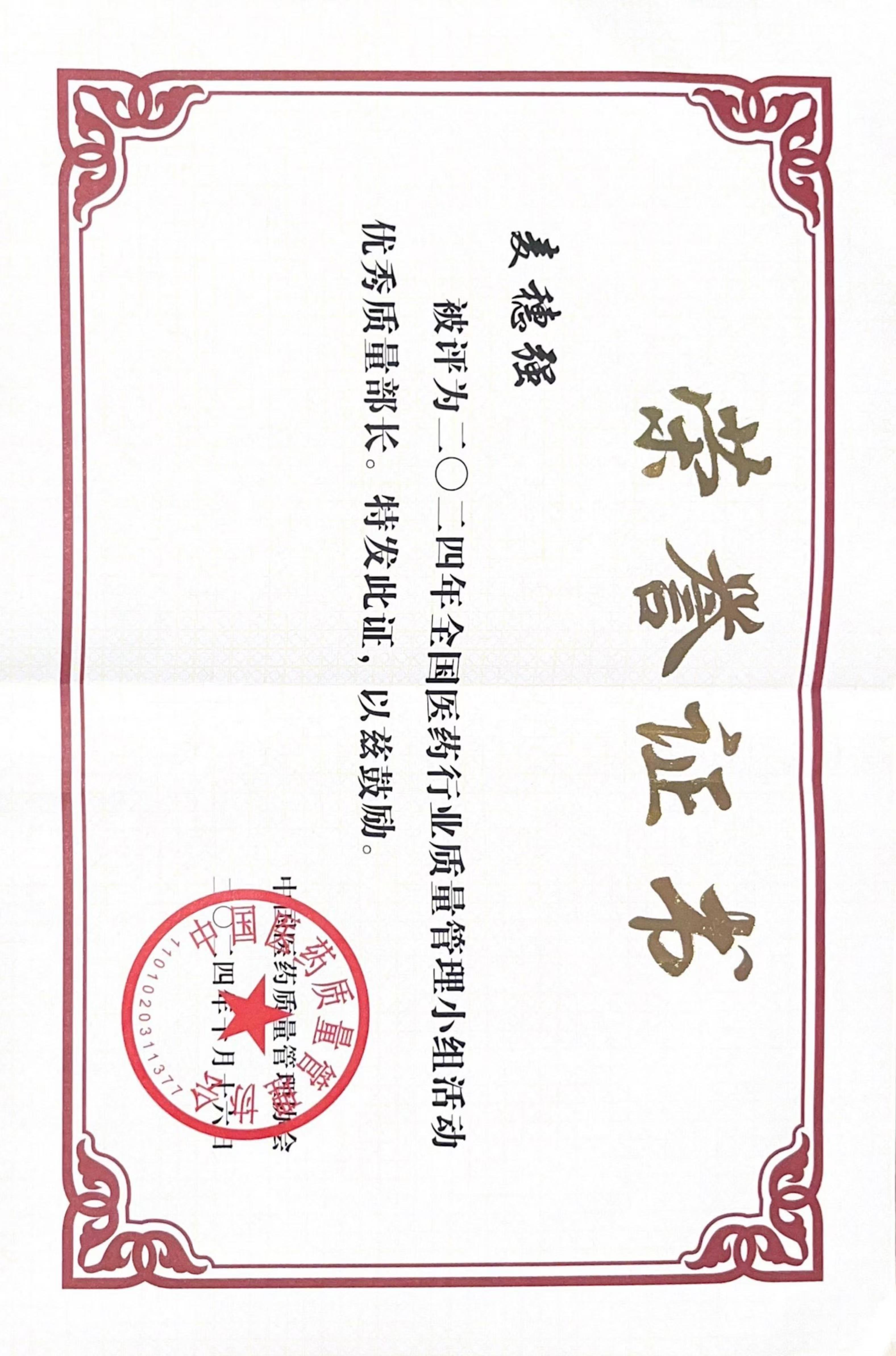 全国医药行业质量管理小组活动优秀质量部长证书