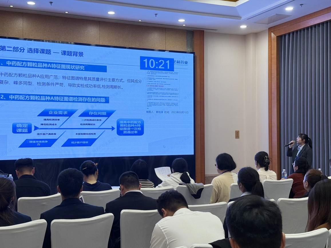 在会议分组发表交流中,采芝林药业的代表积极发言,分享了公司在生产和质量管理方面的宝贵经验和创新实践,详细介绍公司在酸枣仁包装和销售供应链管理、中药配方颗粒品种A检测质量改进方法、创新技术应用以及可持续管理成果,并与其他代表进行了深入交流和探讨。