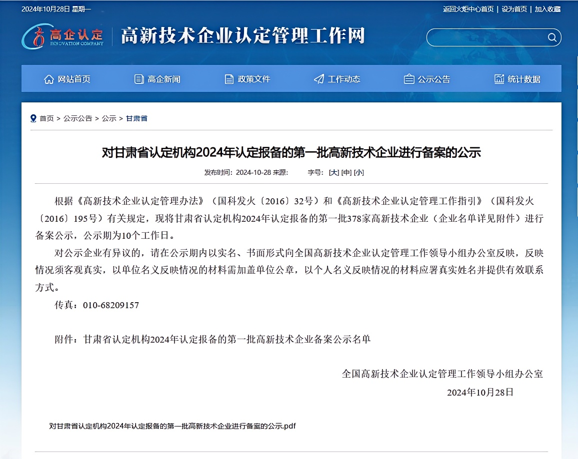 10月28日,全国高新技术企业认定管理工作领导小组办公室发布了《甘肃省认定机构2024年认定报备的第一批高新技术企业进行备案的公示》,经过企业申报、形式审查、专家评审、公示等程序,采芝林甘肃公司荣获2024年“高新技术企业”称号!