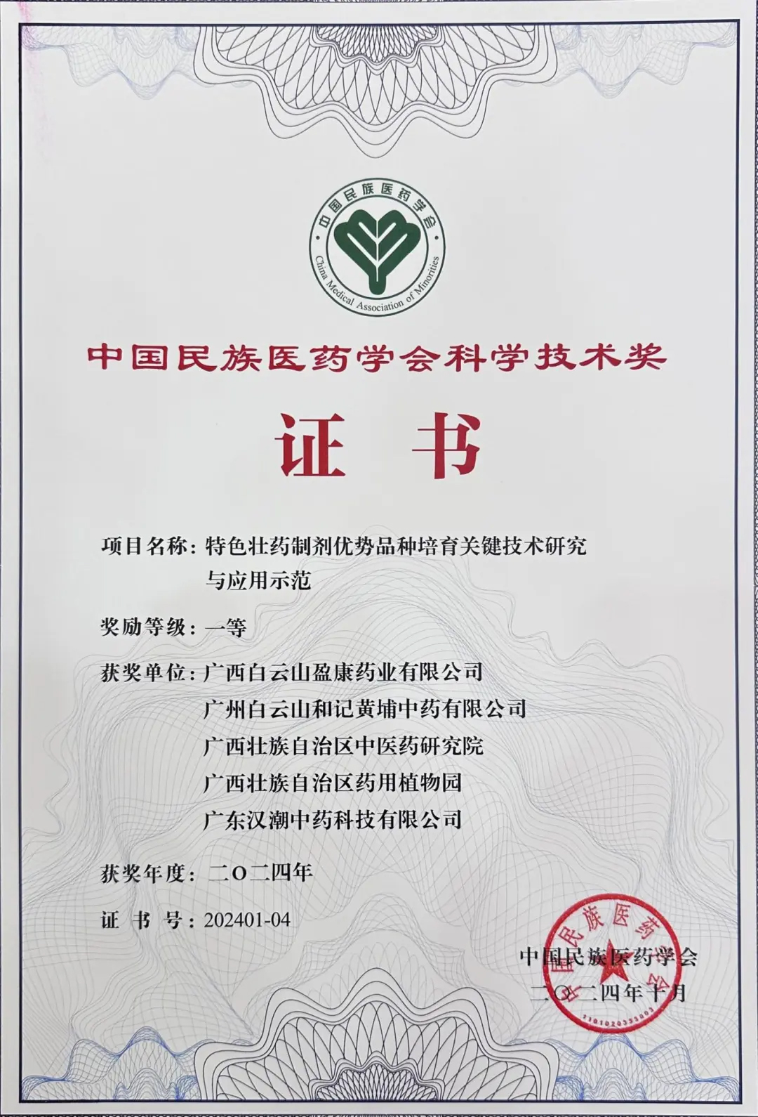 近日,由中国民族医药学会主办的中国民族医药学会2024年学术大会在北京召开。会上举行了2024年度科学技术奖颁奖仪式,广西白云山盈康药业有限公司、广州白云山和记黄埔中药有限公司、广西壮族自治区中医药研究院、广西壮族自治区药用植物园和广东汉潮中药科技有限公司等共同承担的“特色壮药制剂优势品种培育关键技术研究与应用示范”项目荣获中国民族医药学会科学技术奖一等奖。