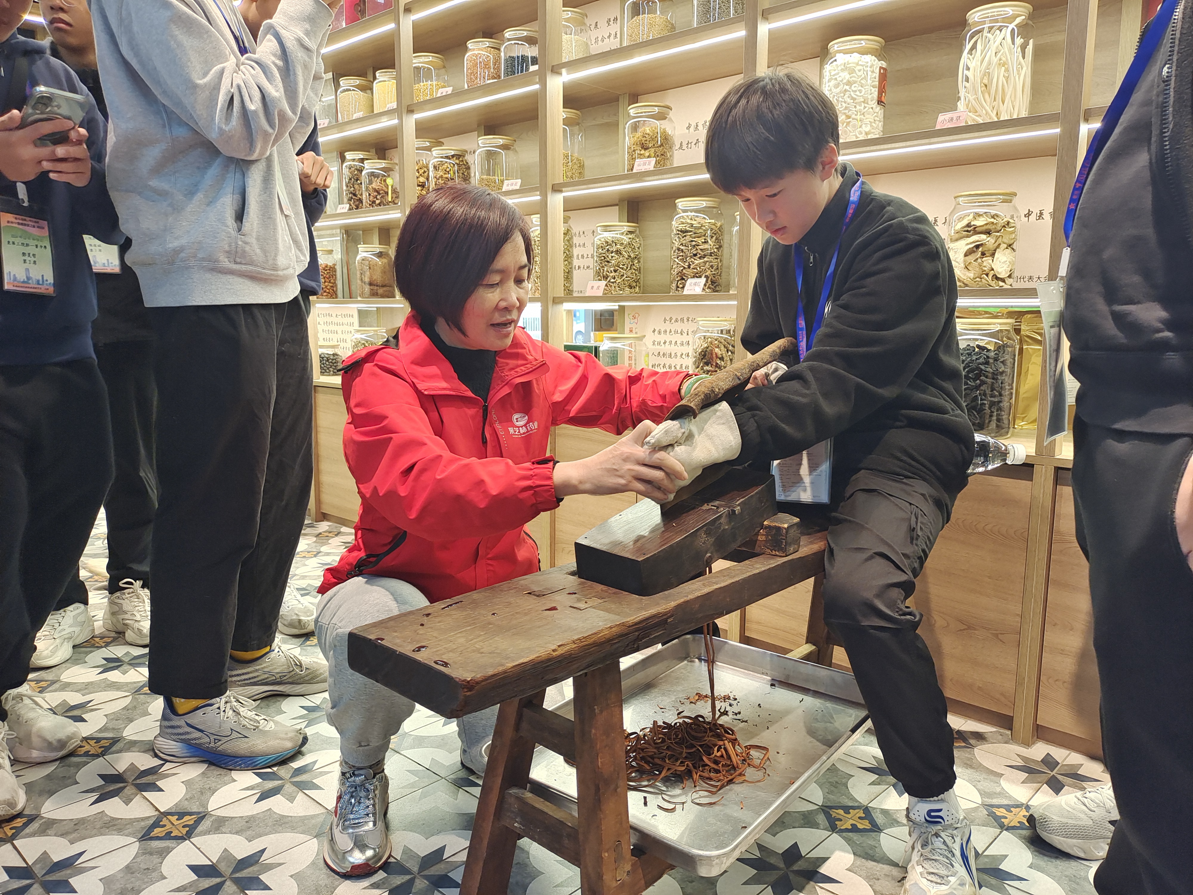 来到非遗体验区,师生们亲身体验了传统中药炮制技艺——刨肉桂。在专业讲解老师的指导下,小心翼翼地操作着工具,将肉桂慢慢刨成薄片,感受中药材在自己手中的变化,感受传统技艺的趣味与魅力。