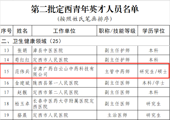 近日,甘肃省定西市人力资源和社会保障局公示了第二批定西青年英才名单,采芝林药业属下甘肃公司常务副总经理范伟兵凭借其在中医药领域的杰出表现成功跻身其中,该名单是根据《定西青年英才选拔管理办法》,经自下而上、层层推荐、严格把关,组织专家评议,并提交市委人才工作领导小组会议研究确定。这一荣誉也是对甘肃公司在人才培养、科技创新和社会责任领域成果的极大肯定。