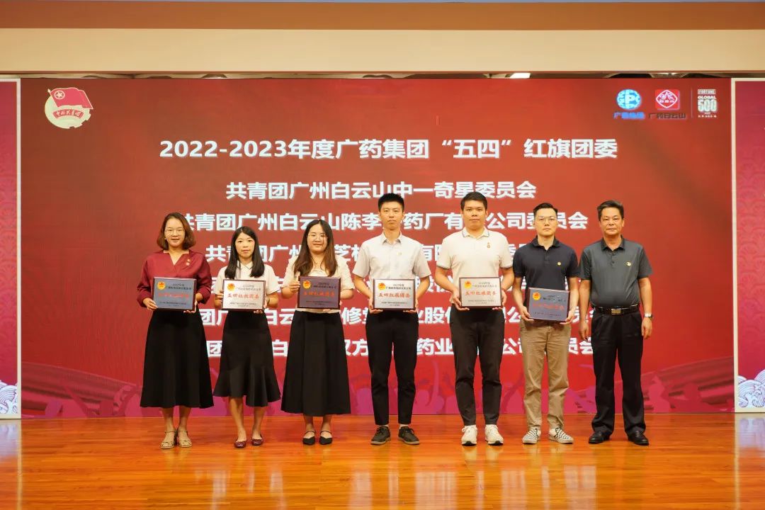 采芝林药业团委获得“广药集团五四红旗团委”称号,王金龙(右三)作为代表上台领奖