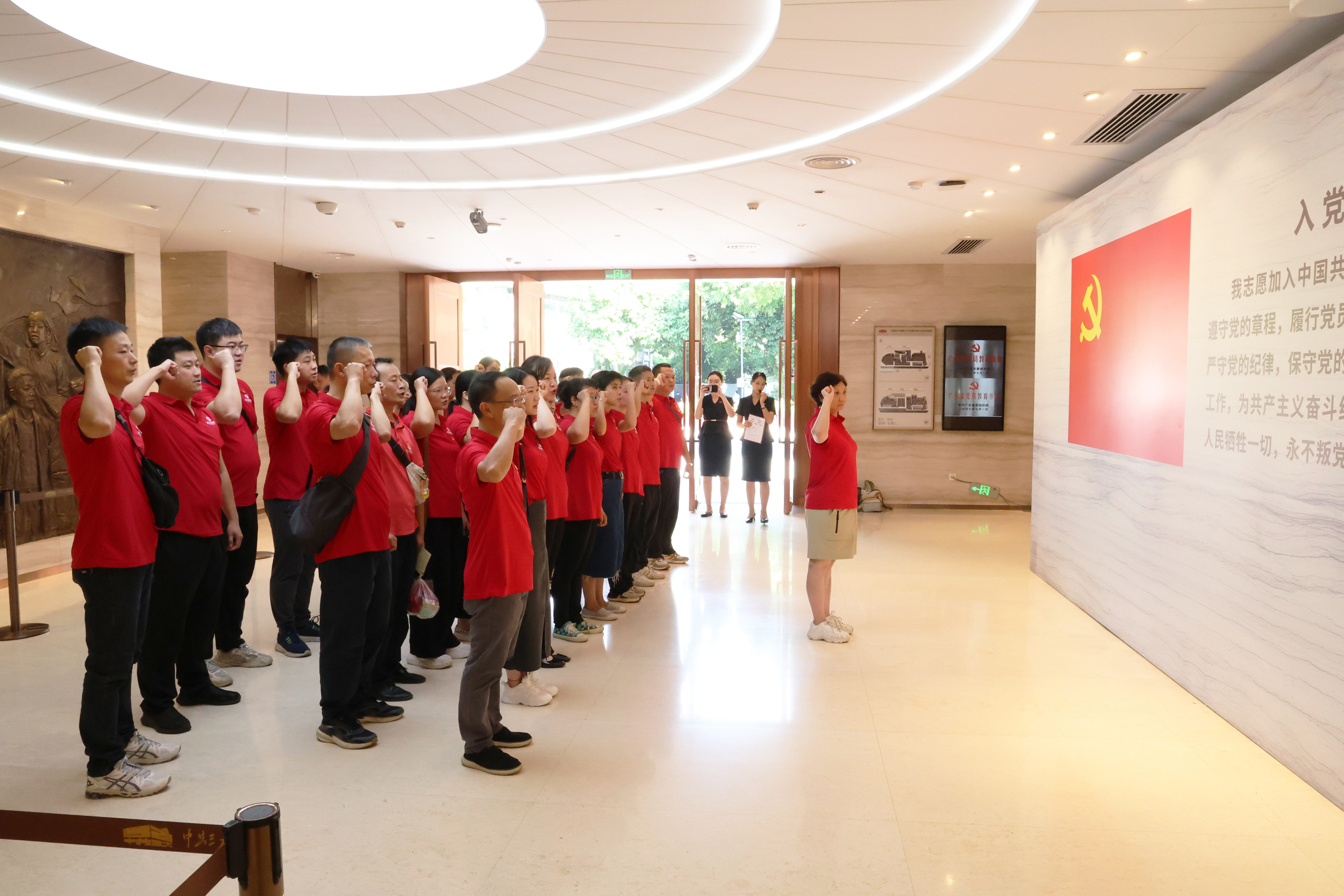 党员代表们怀着崇敬的心情,踏入了这座承载着中国革命重要记忆的历史圣地。在庄严的党旗前,他们举起右手,满怀激情地重温入党誓词。