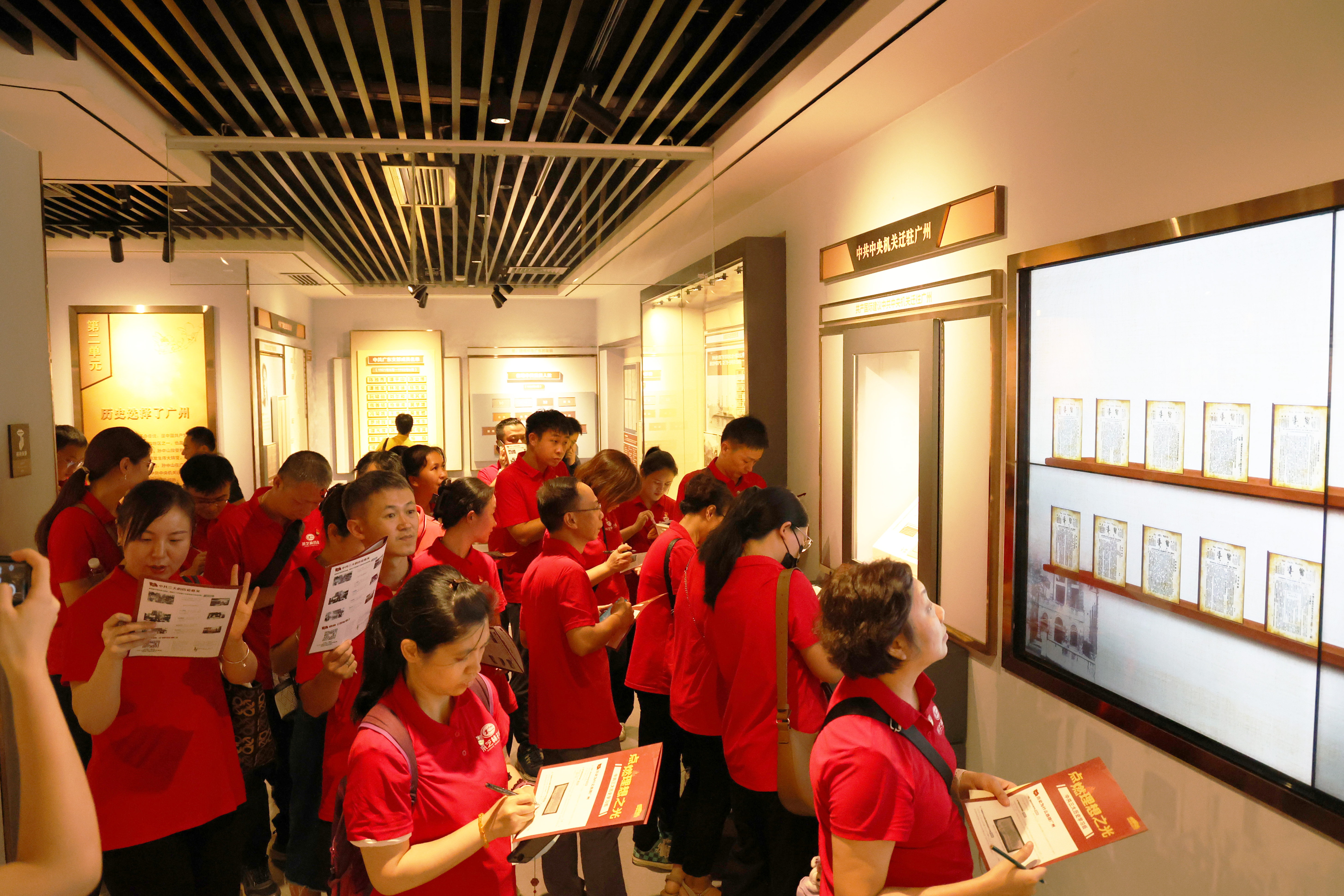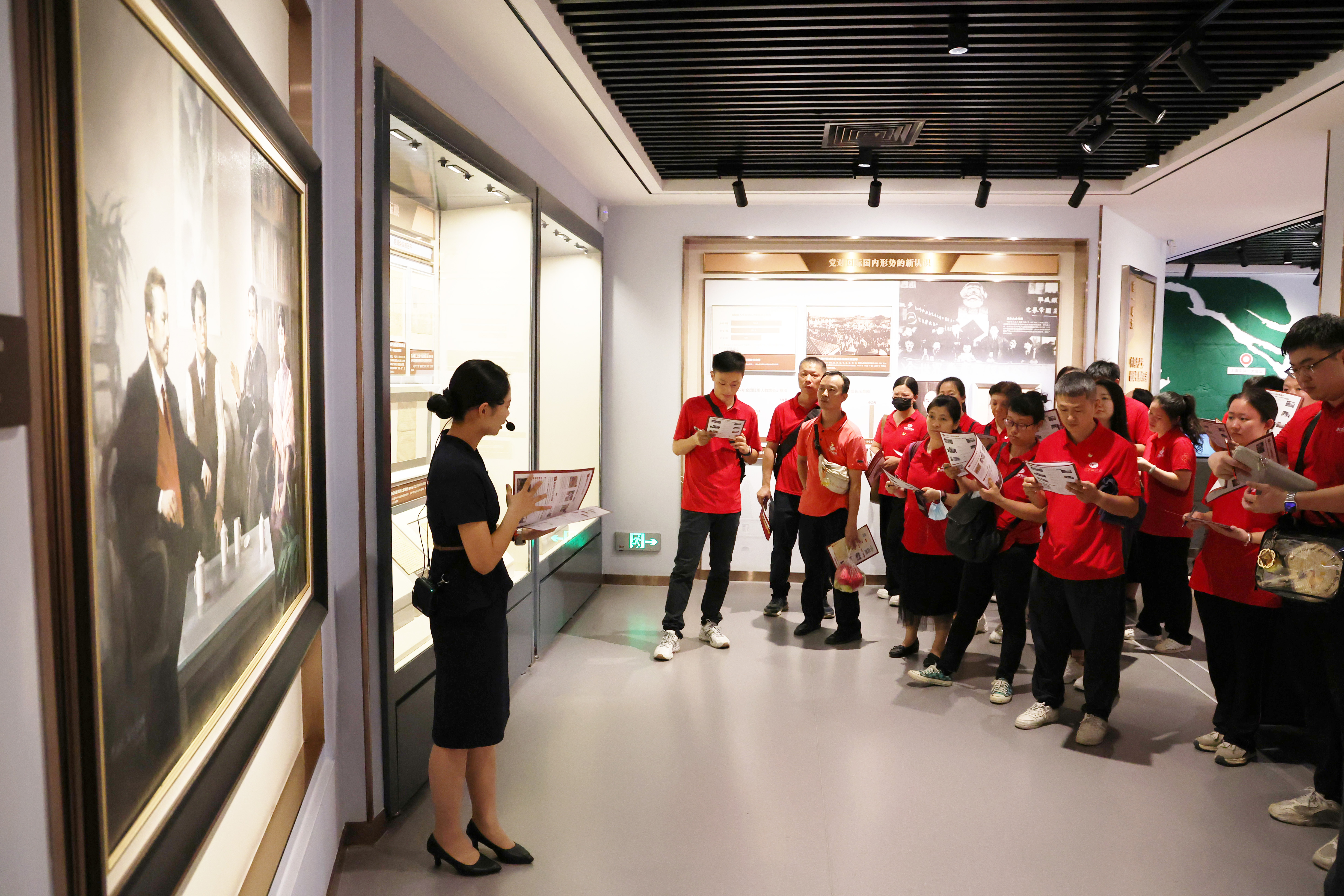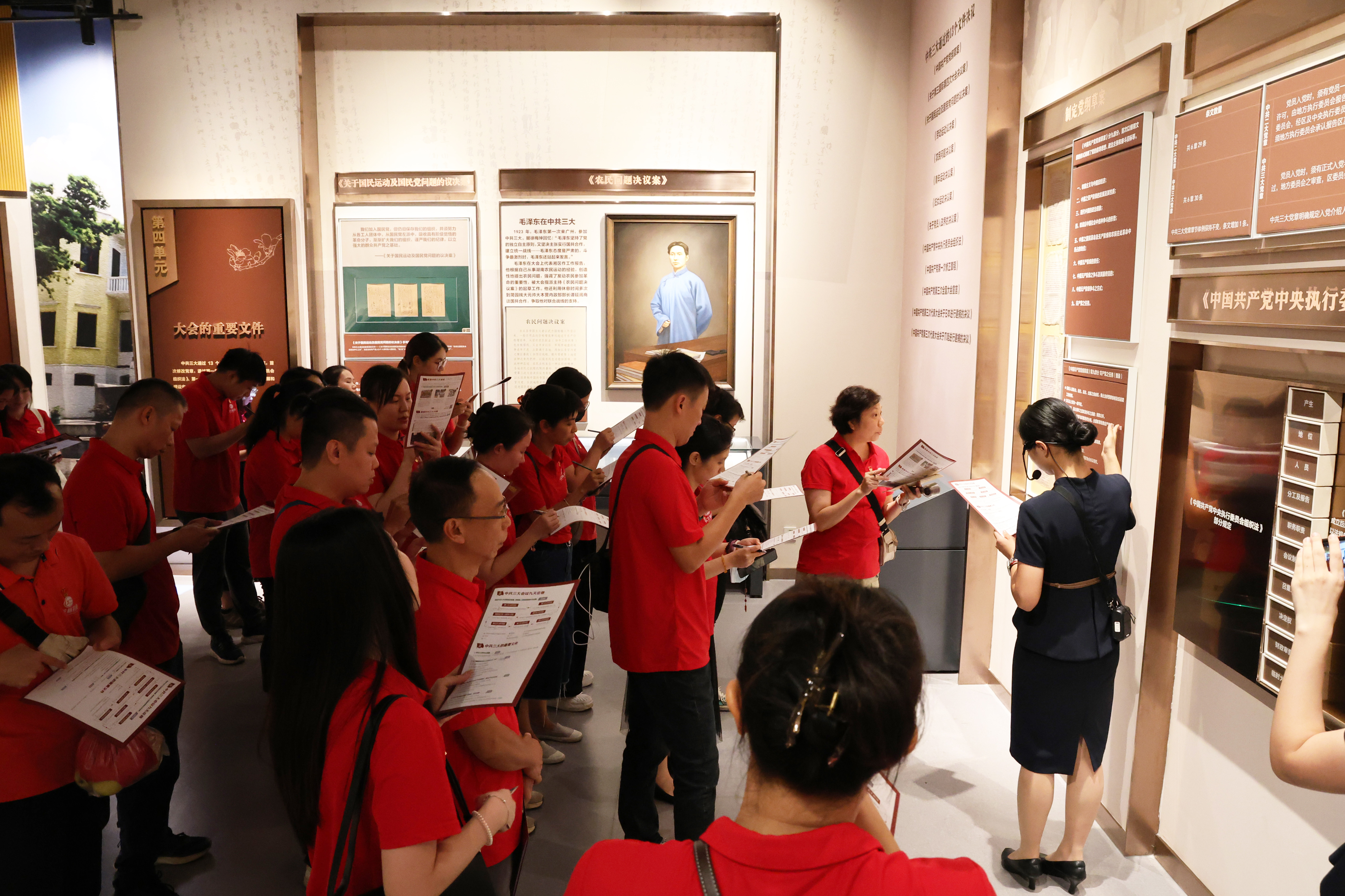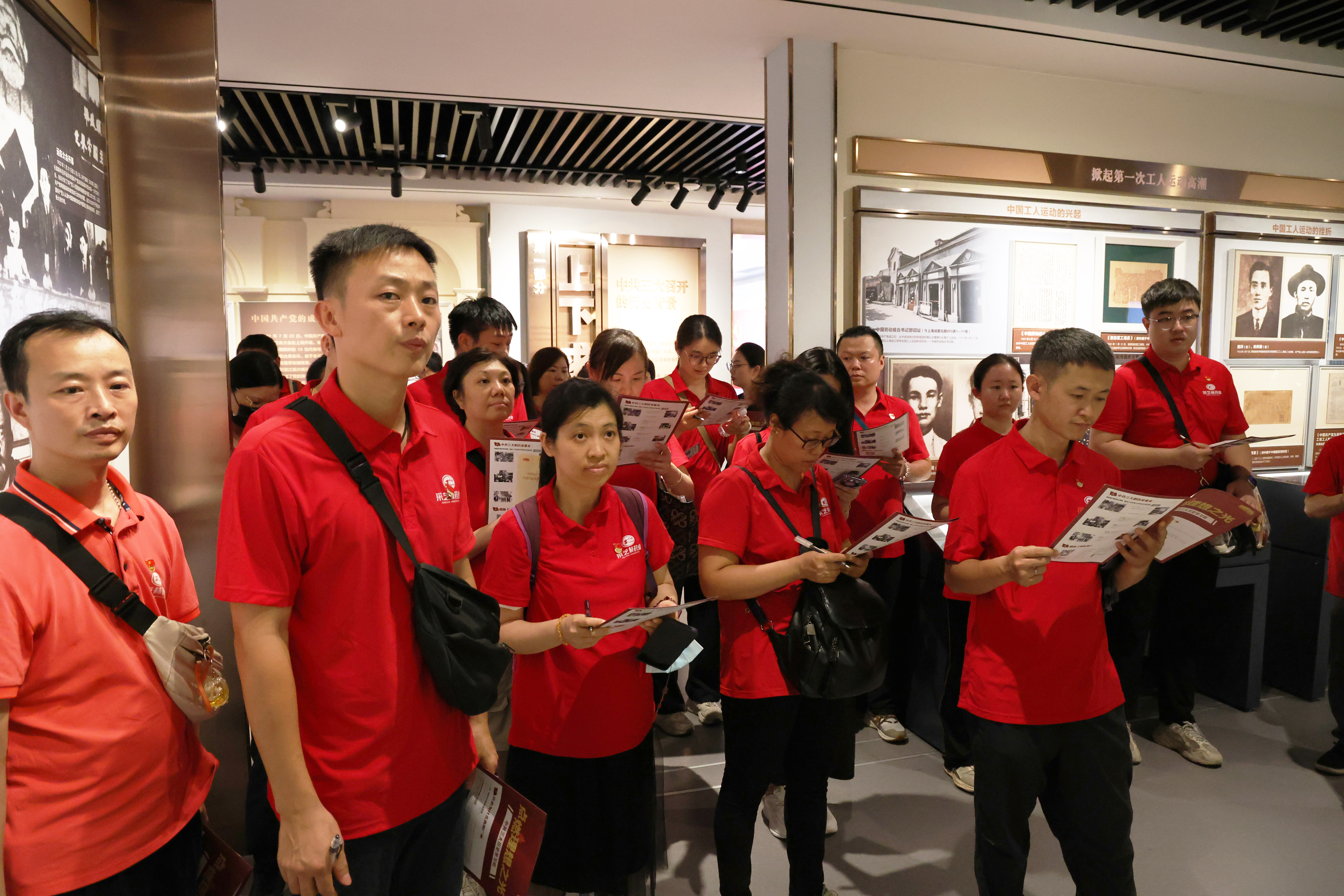 随后,讲解员以“边听边学、边记边思、边寻边悟”的沉浸式学习形式,带领党员代表们手持学习纸,沿着历史的足迹,一步步走进那段波澜壮阔的岁月。其间,讲解员不仅详细讲述了中共党员人数的增长轨迹、中国共产党中央委员会的发展历程、重要文件背后的深远意义,还生动讲述了革命先驱的感人故事,陈独秀、李大钊、毛泽东等革命先驱的光辉形象跃然心上。