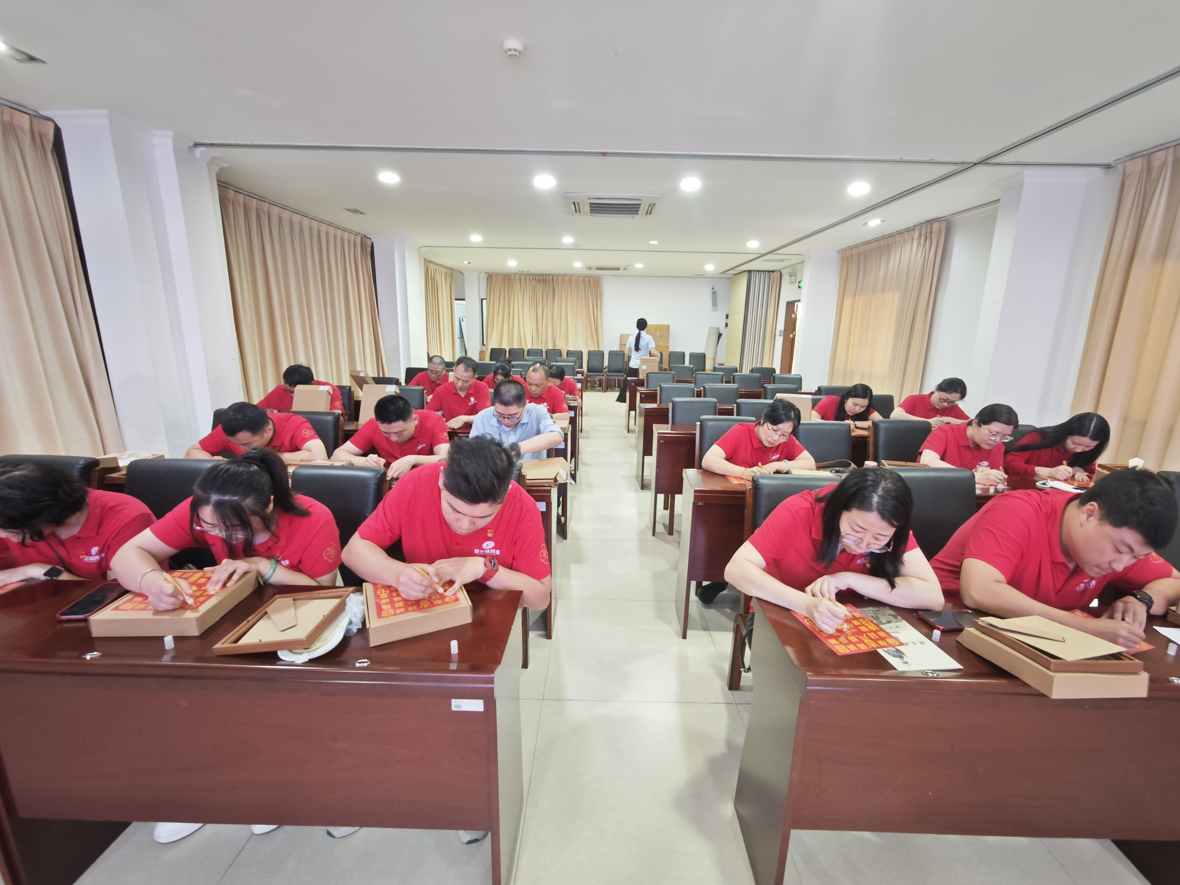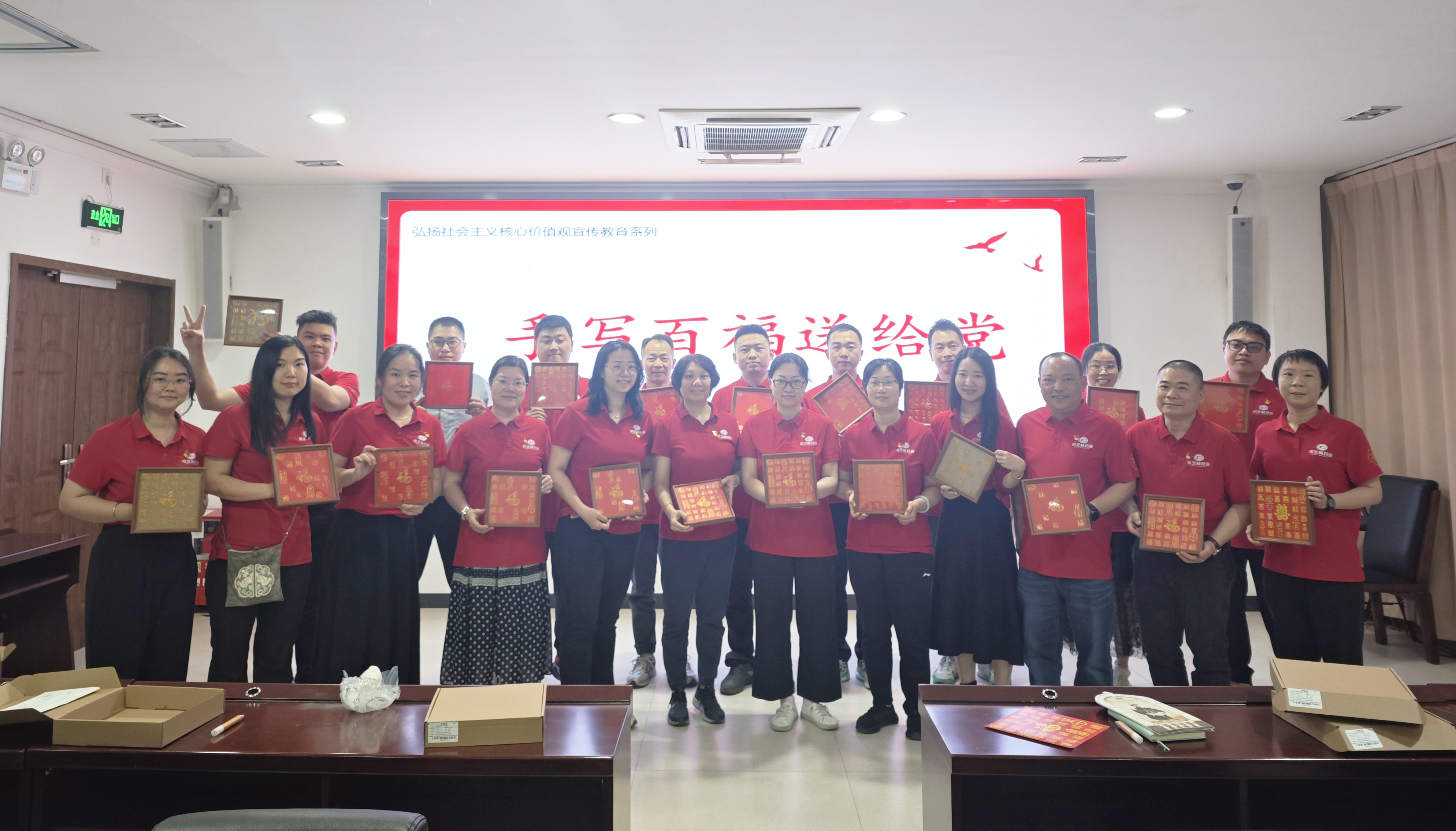 紧接着开展的“手写‘百福’献给党”活动中,党员们围坐一起,手持画笔全神贯注描绘每个不重样的福字,时而交流技法、时而切磋心得。通过金色颜料与细腻笔触的结合,“百福图”被赋予独特寓意:如果信仰有颜色,那一定是中国红;这一活动既表达对美好生活的向往,更寄托着对党的诚挚祝福。
