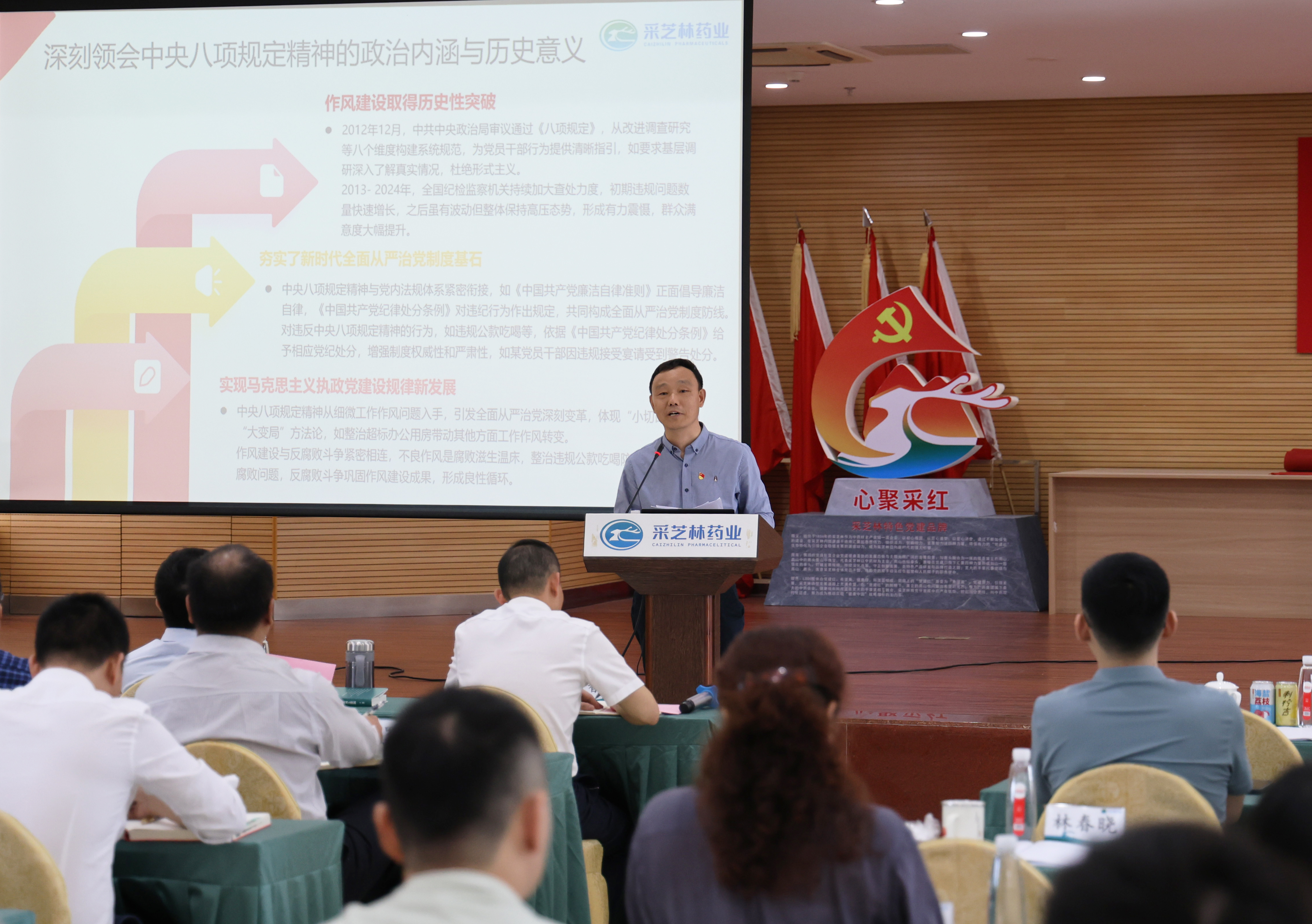 随后,王健松以《学习贯彻中央八项规定精神,推动党业深度融合 以优良作风护航企业高质量发展》为主题,讲授了一堂内涵丰富、指导性强的专题党课。党课从理论高度系统阐释了中央八项规定精神的政治内涵与历史意义,通过回顾八项规定实施以来党风政风发生的显著变化,深刻阐述了这一制度安排在密切党群关系、净化政治生态方面发挥的重要作用。同时,结合采芝林实际,重点探讨了以中央八项规定精神推动党业融合的实践路径,强调要通过强化党建引领,将作风建设成果转化为企业发展动能,实现党建工作与业务工作同频共振、相互促进。