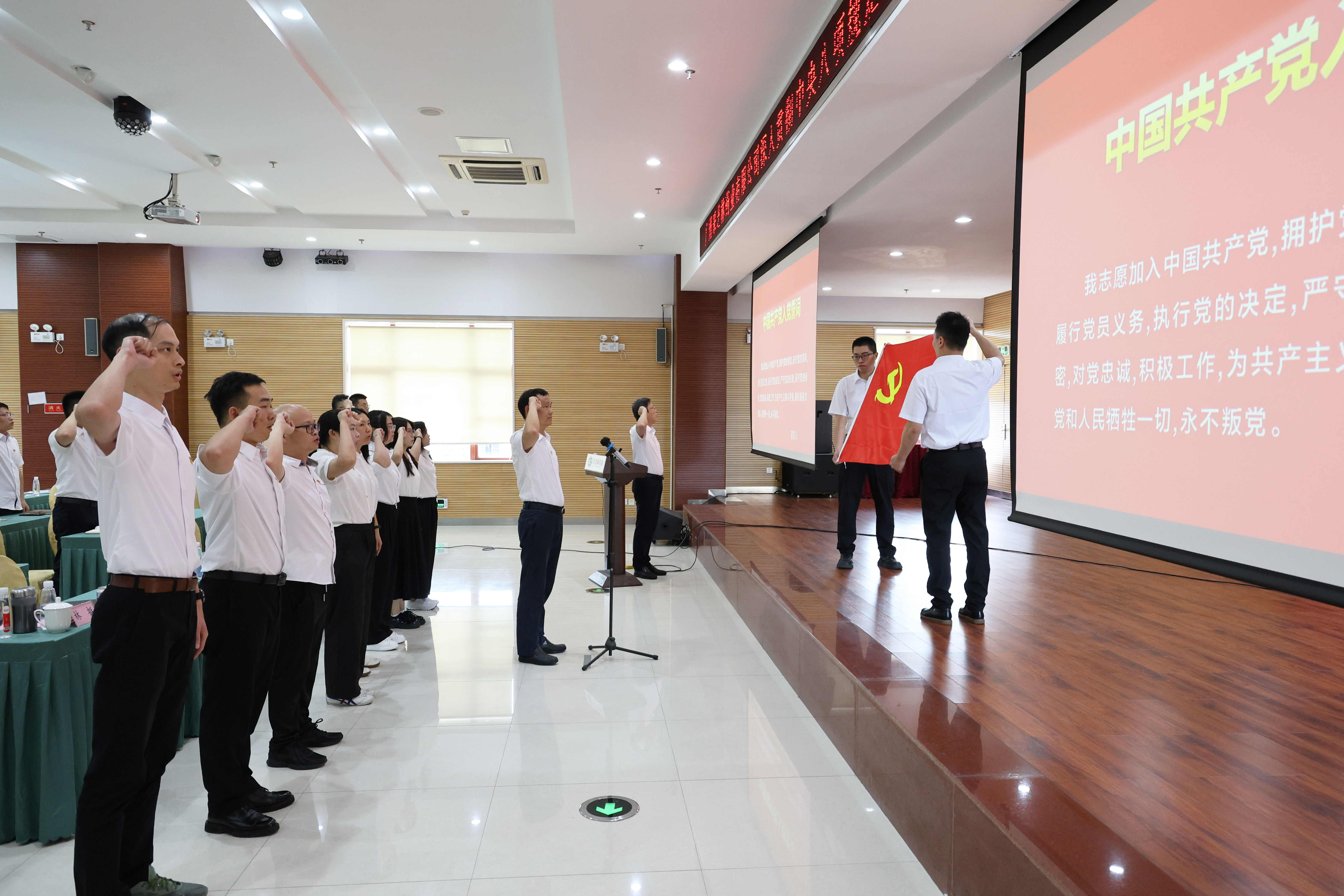 在庄严的宣誓环节,公司党委书记、董事长王健松带领新党员面向党旗,庄严宣誓,全体与会党员重温入党誓词。铿锵有力的誓言在会场回荡,字字千钧,全体党员在铮铮誓言中再次叩问初心、坚定信念。