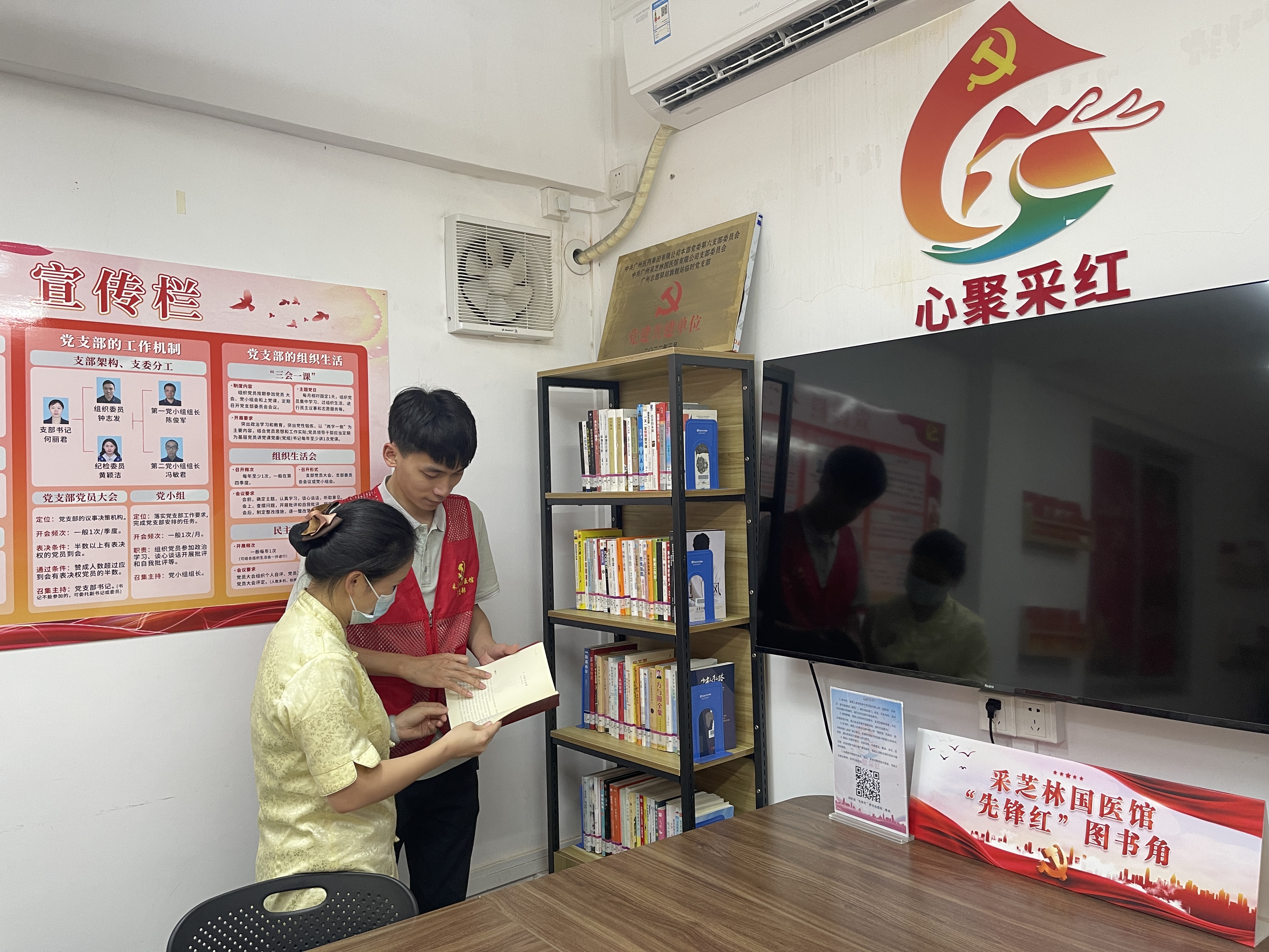 国医馆“先锋红”党员代表利用业余时间,耐心地为职工群众送学、导学